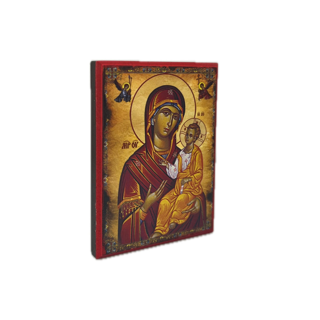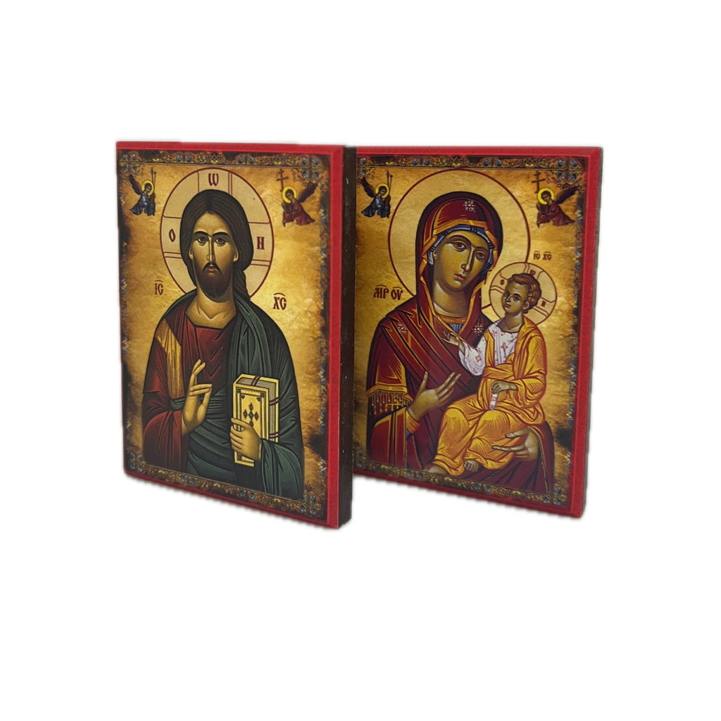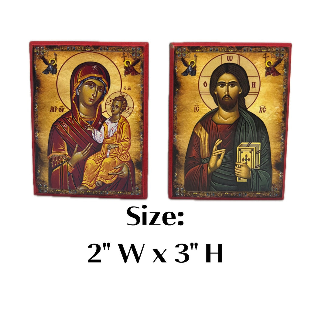These exquisite small Orthodox Christian Byzantine icons of the Theotokos and Jesus Christ are masterpieces crafted by the skilled hands of a dedicated woodworker. Meticulously produced using high-resolution printing techniques, it is delicately mounted on MDF (pressed wood), creating a divine beauty that captures the essence of faith.