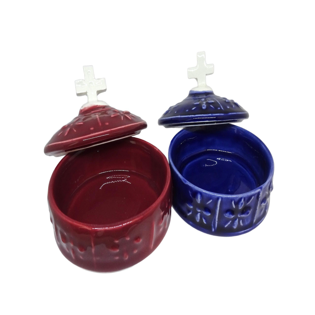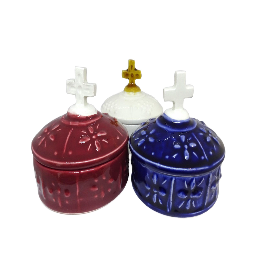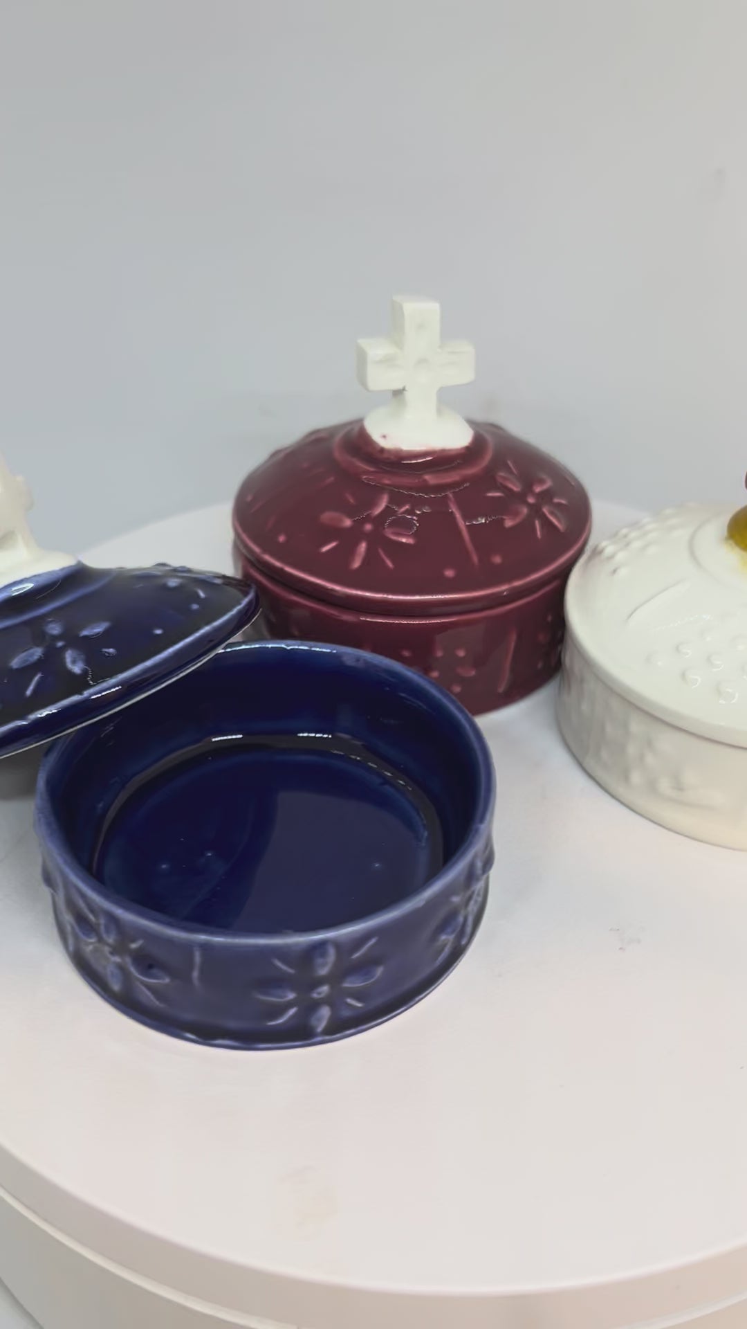 This handmade ceramic keepsake box features a small white cross on the lid and comes in white, dark red, and blue. Perfect for storing jewelry, buttons, incense, or spices, it adds a refined touch to any space.