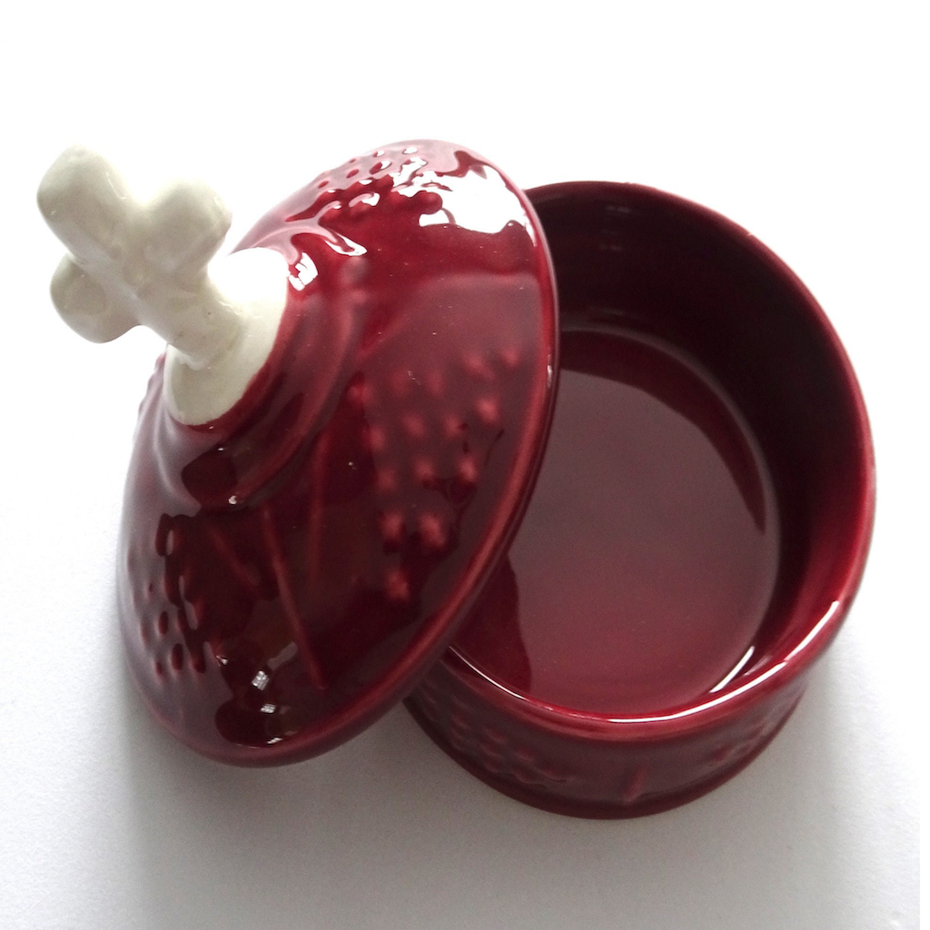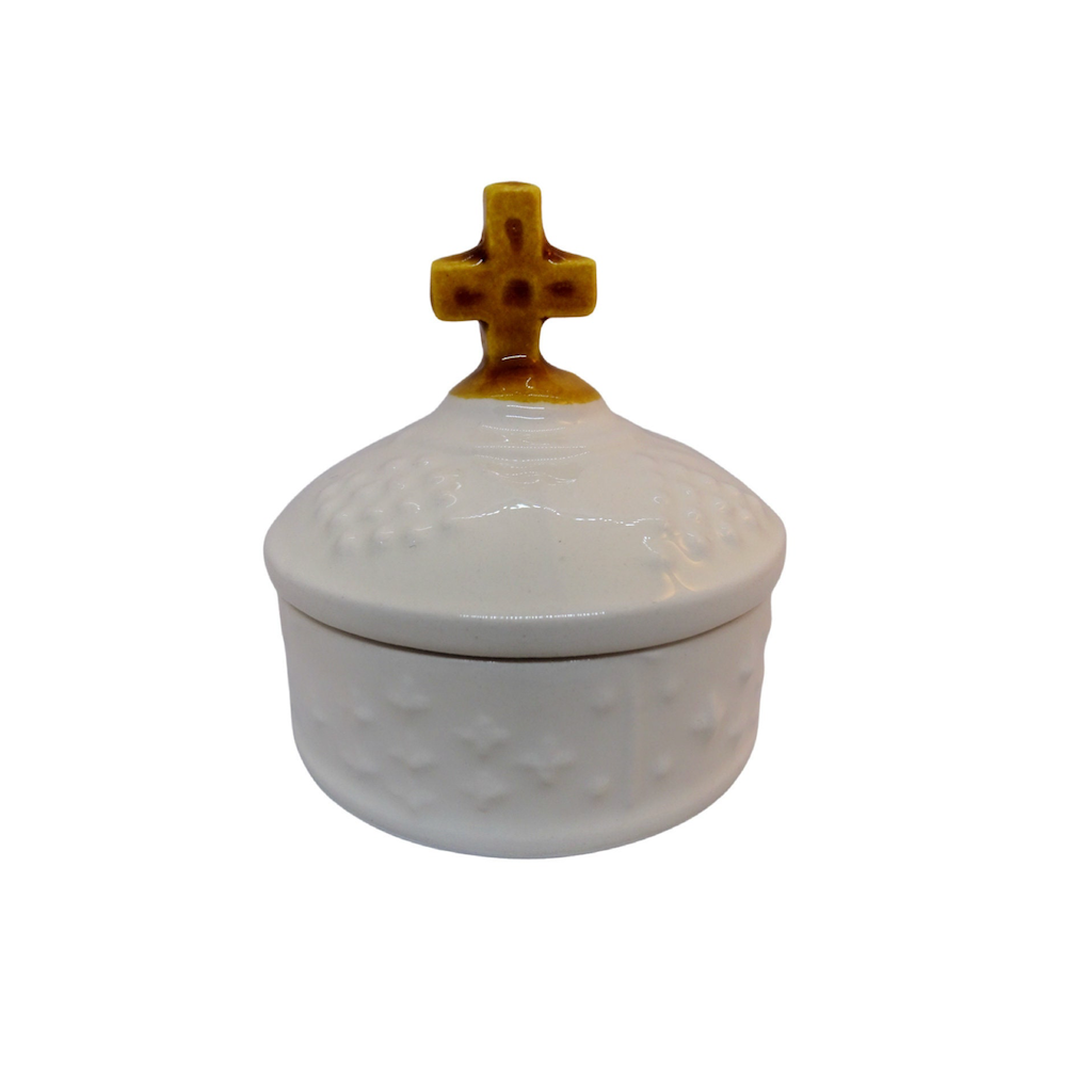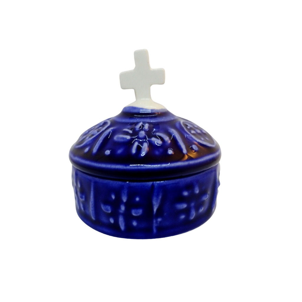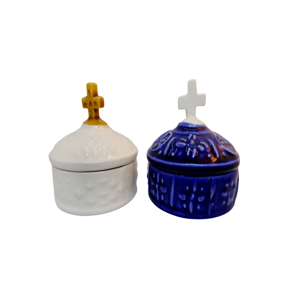 This handmade ceramic keepsake box features a small white cross on the lid and comes in white, dark red, and blue. Perfect for storing jewelry, buttons, incense, or spices, it adds a refined touch to any space.
