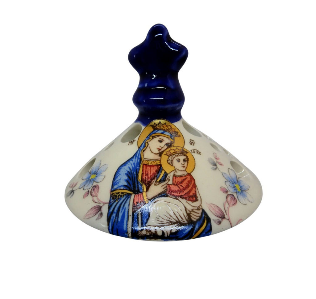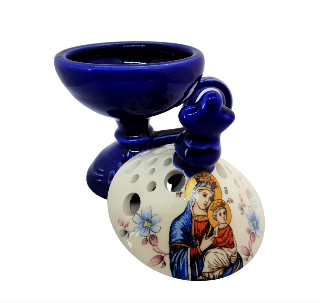 This ceramic incense burner is suitable for everyday incense burning at your home. This beautiful censer features an imprinted icon of the Holy Theotokos on the lid.