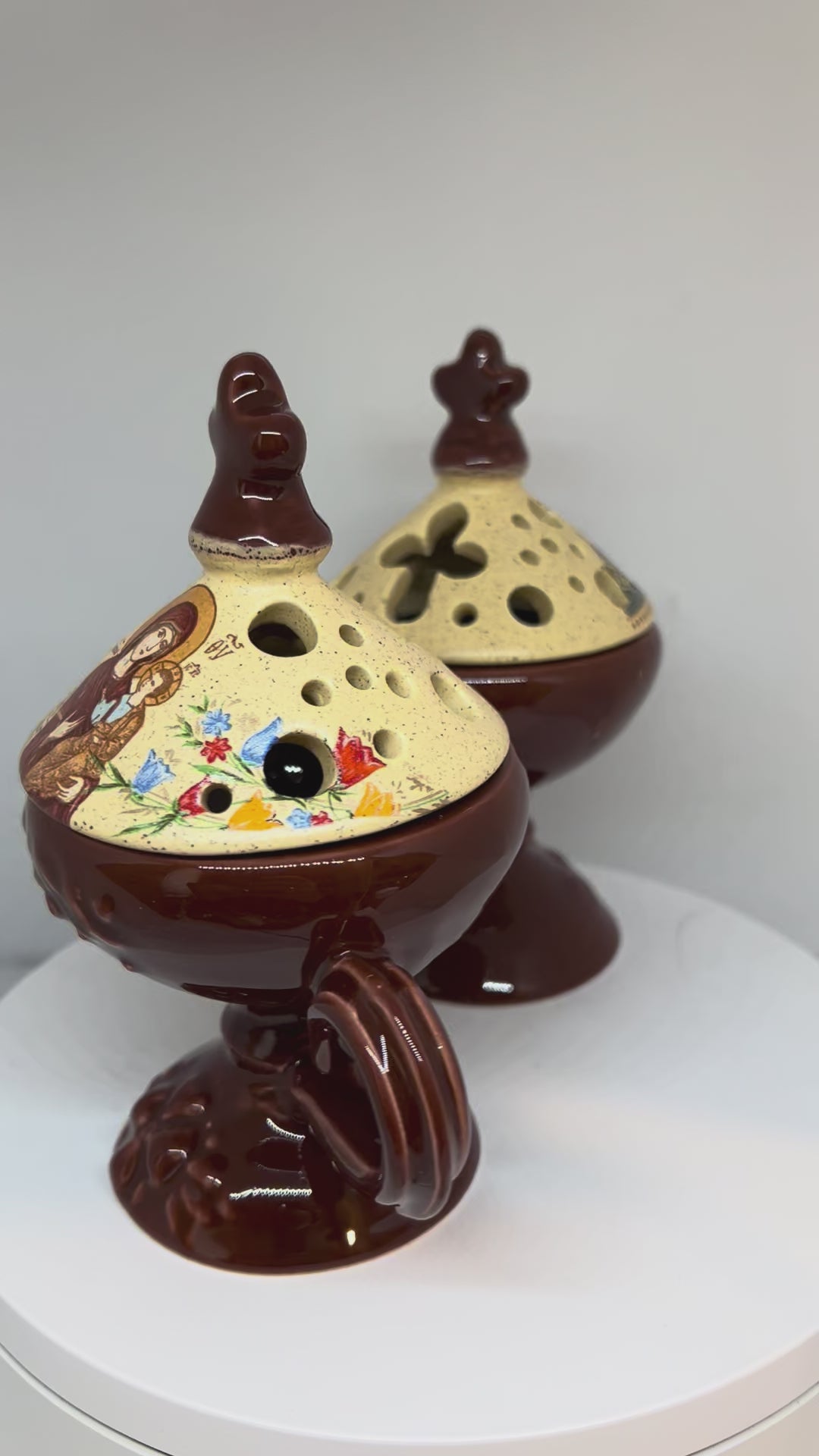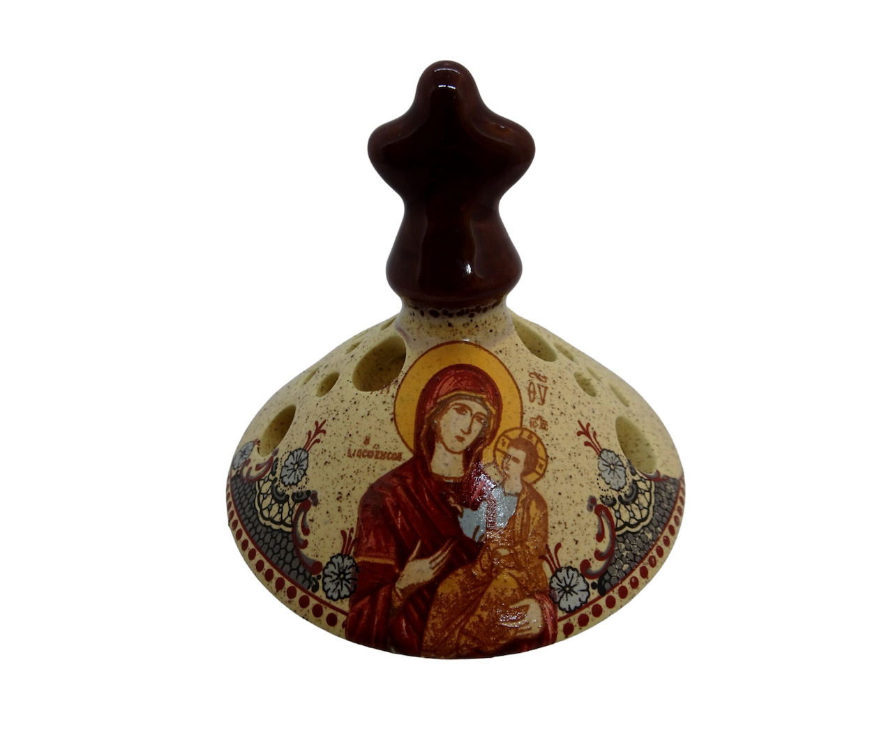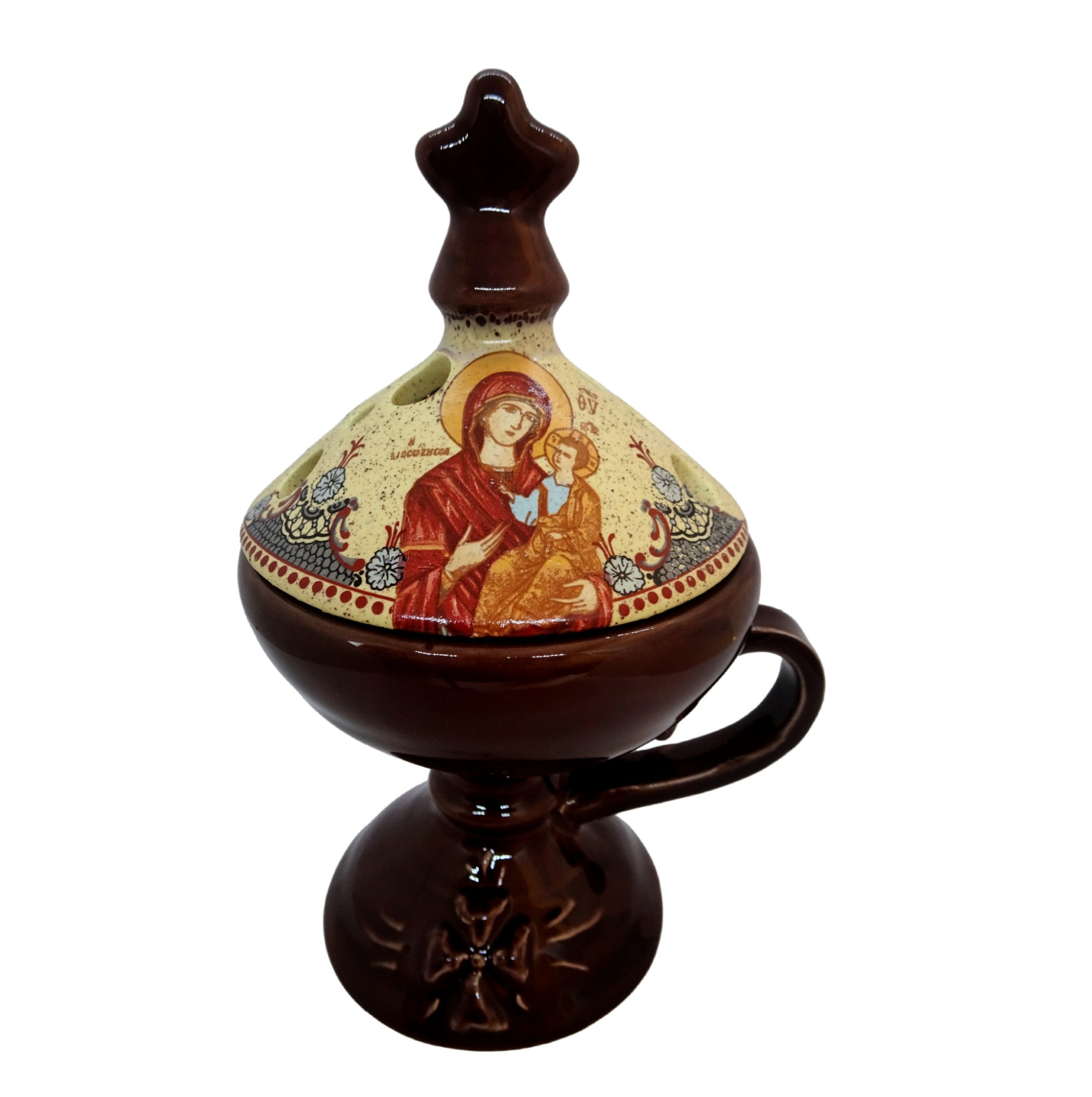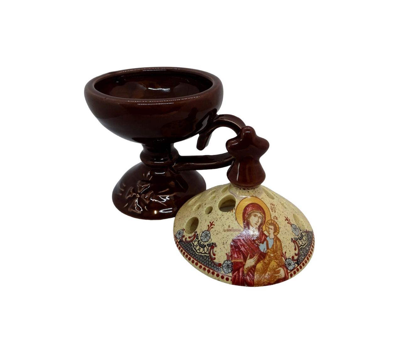 This ceramic Orthodox incense burner comes with a lid featuring an image icon of the Holy Theotokos surrounded by decorative flowers.