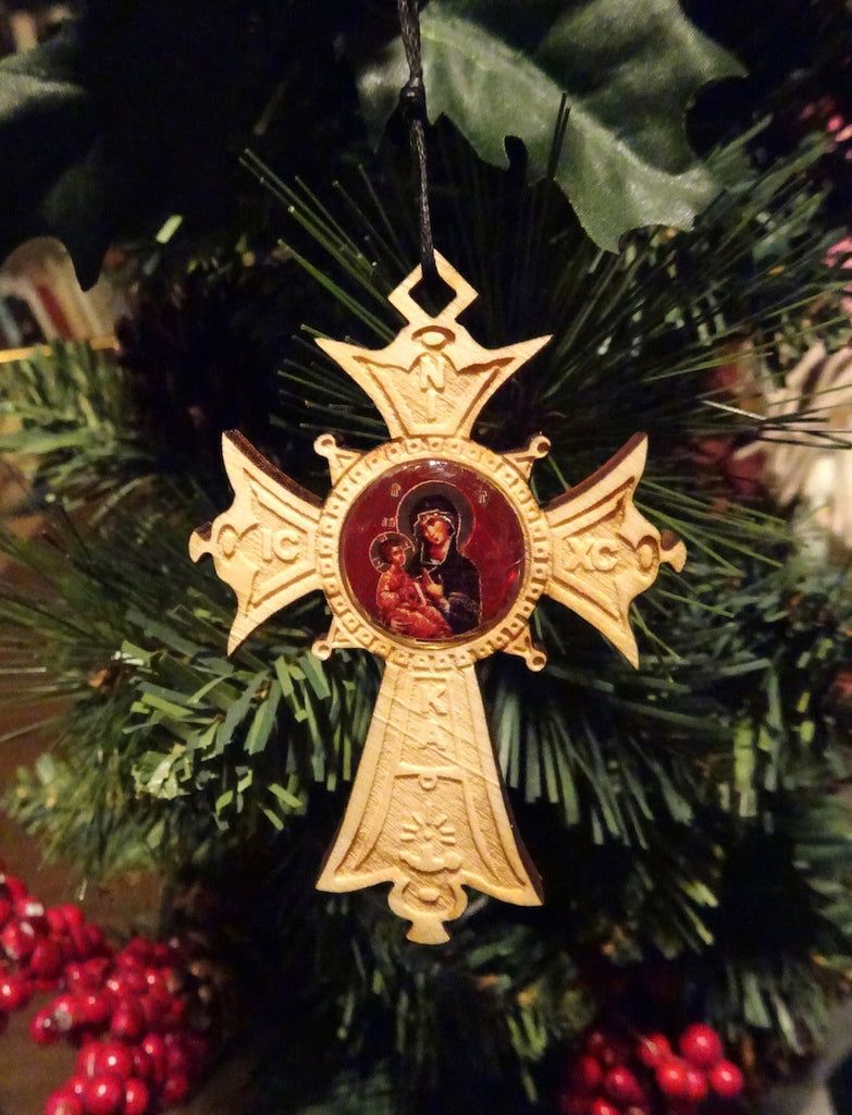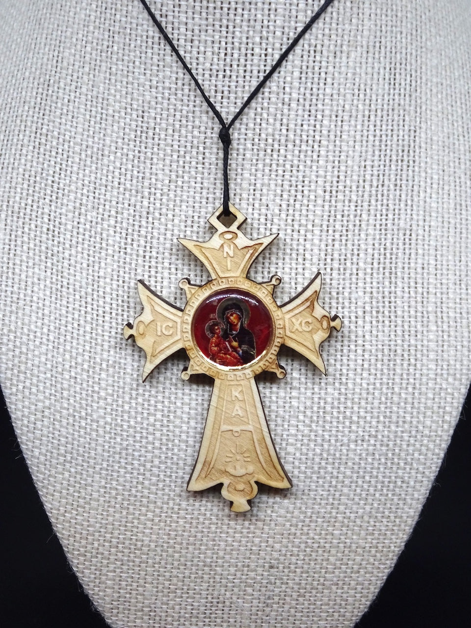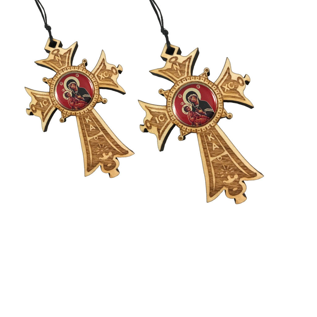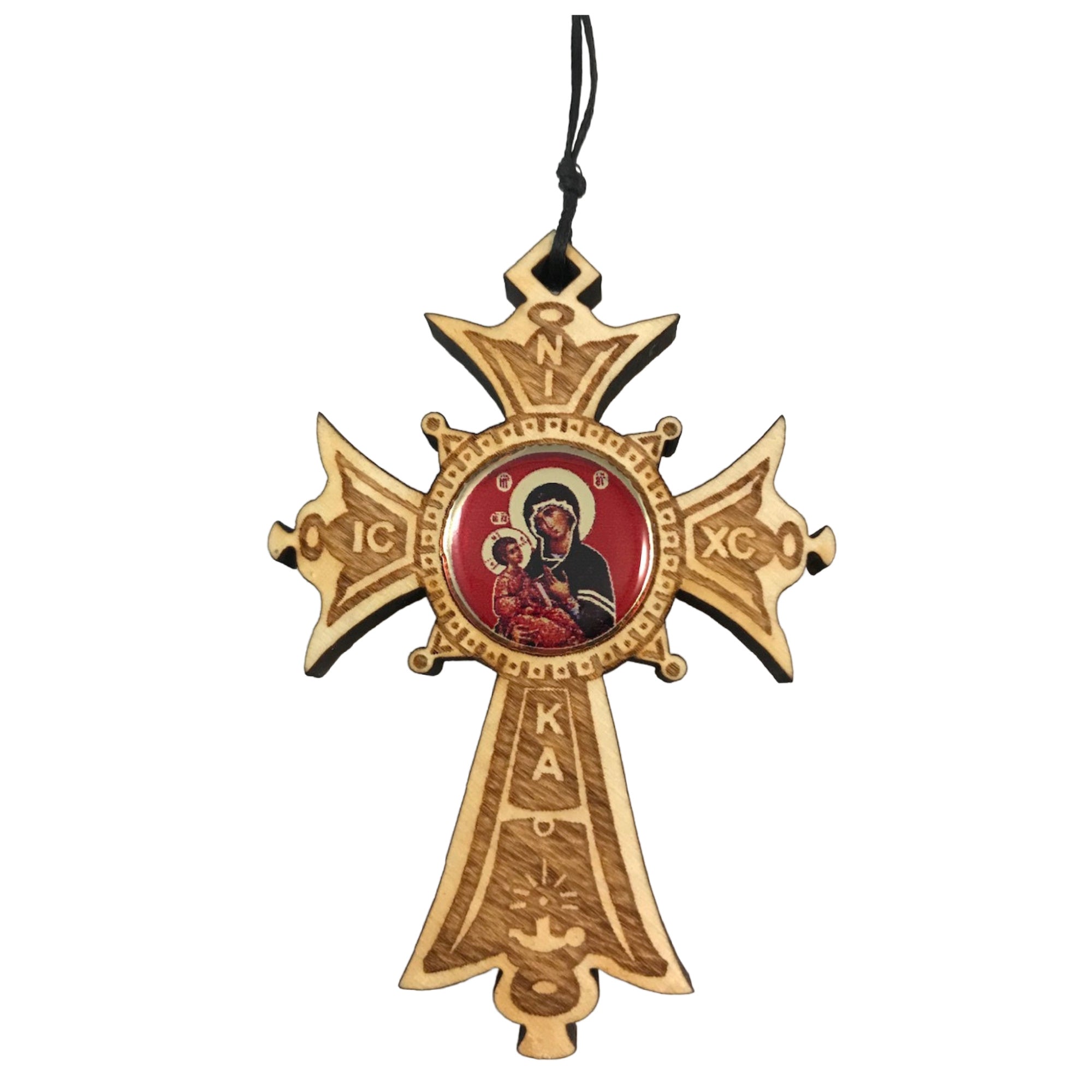 This finely crafted Orthodox wooden cross ornament features precise laser engraving and showcases a miniature ½" icon of the Virgin Mary holding Child Jesus, mounted at its center.