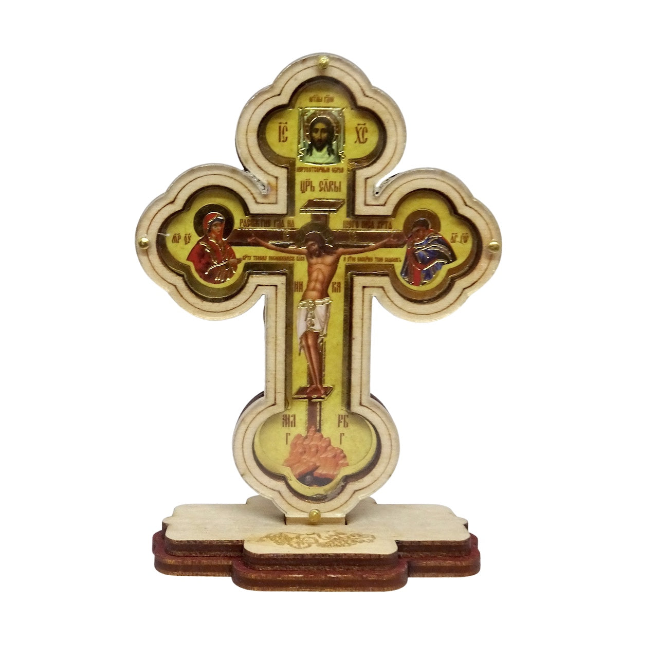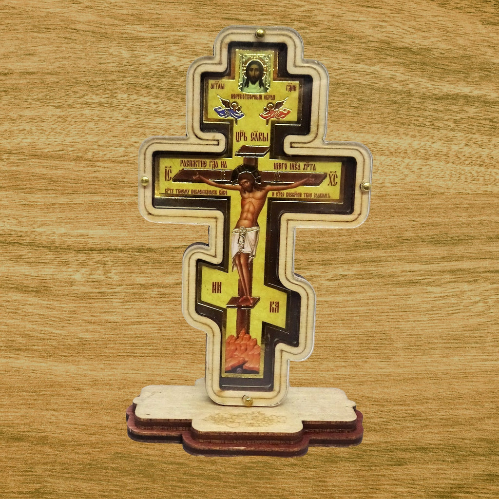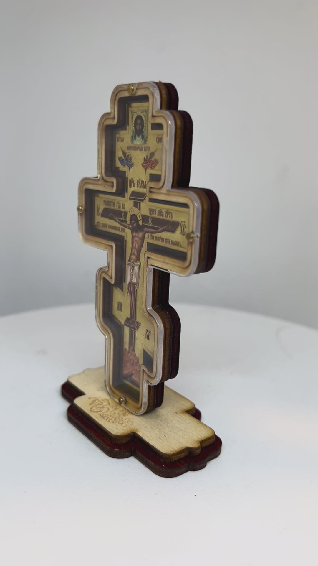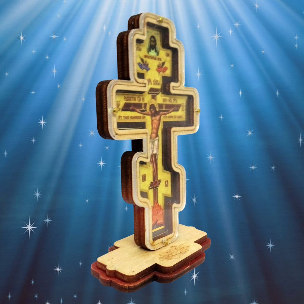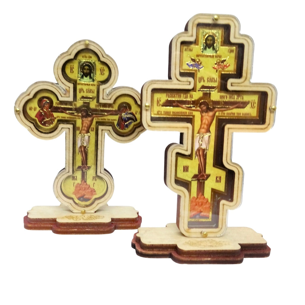 Their freestanding design makes them easy to place on any flat surface and convenient to move or travel with. Each cross displays a crucifix image of Jesus Christ accompanied by the inscription “IC XC NI KA” (Jesus Christ the Conqueror) and “Car Slavi” (“The King of Glory”) above His head.