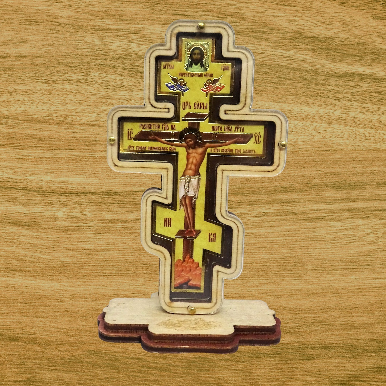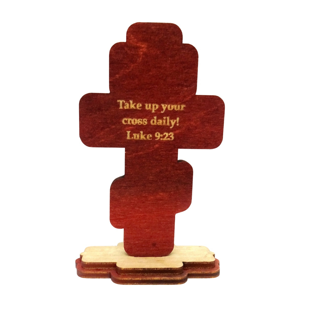 These standing wooden Christian crosses are crafted from pressed beechwood with detailed high engraving. Mounted on a sturdy base, they serve as elegant accents suitable for homes, offices, dorm rooms, or churches.